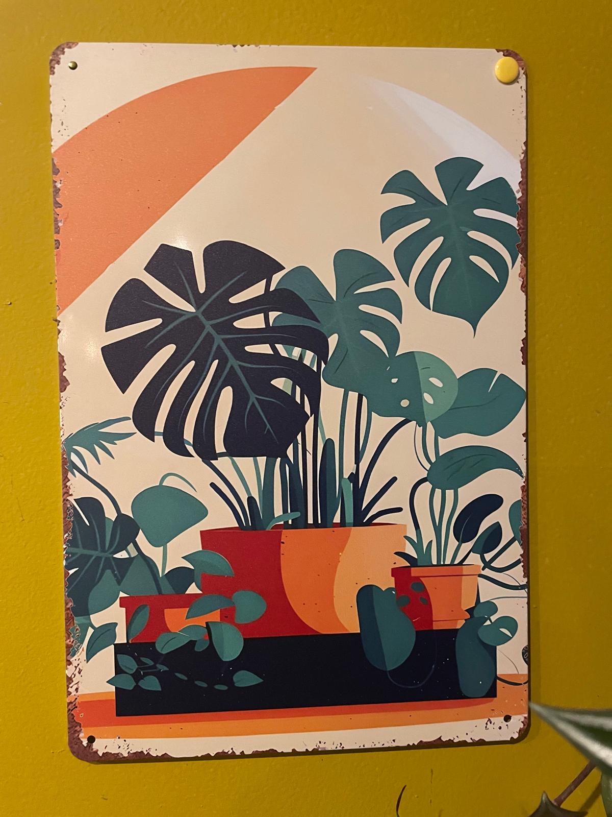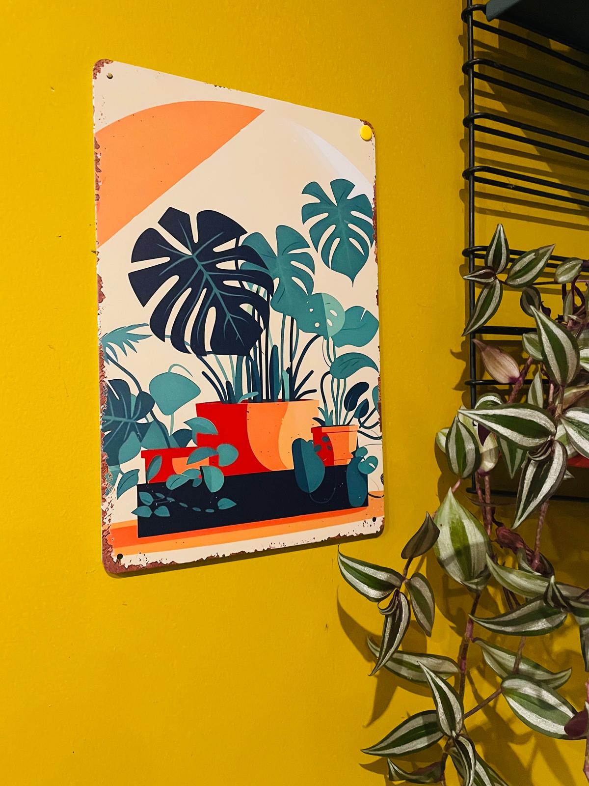 Parfaite pour les amateurs de design vintage et de décoration botanique audacieuse, cette plaque en tôle apporte instantanément une touche d’optimisme et de fraîcheur à votre espace.