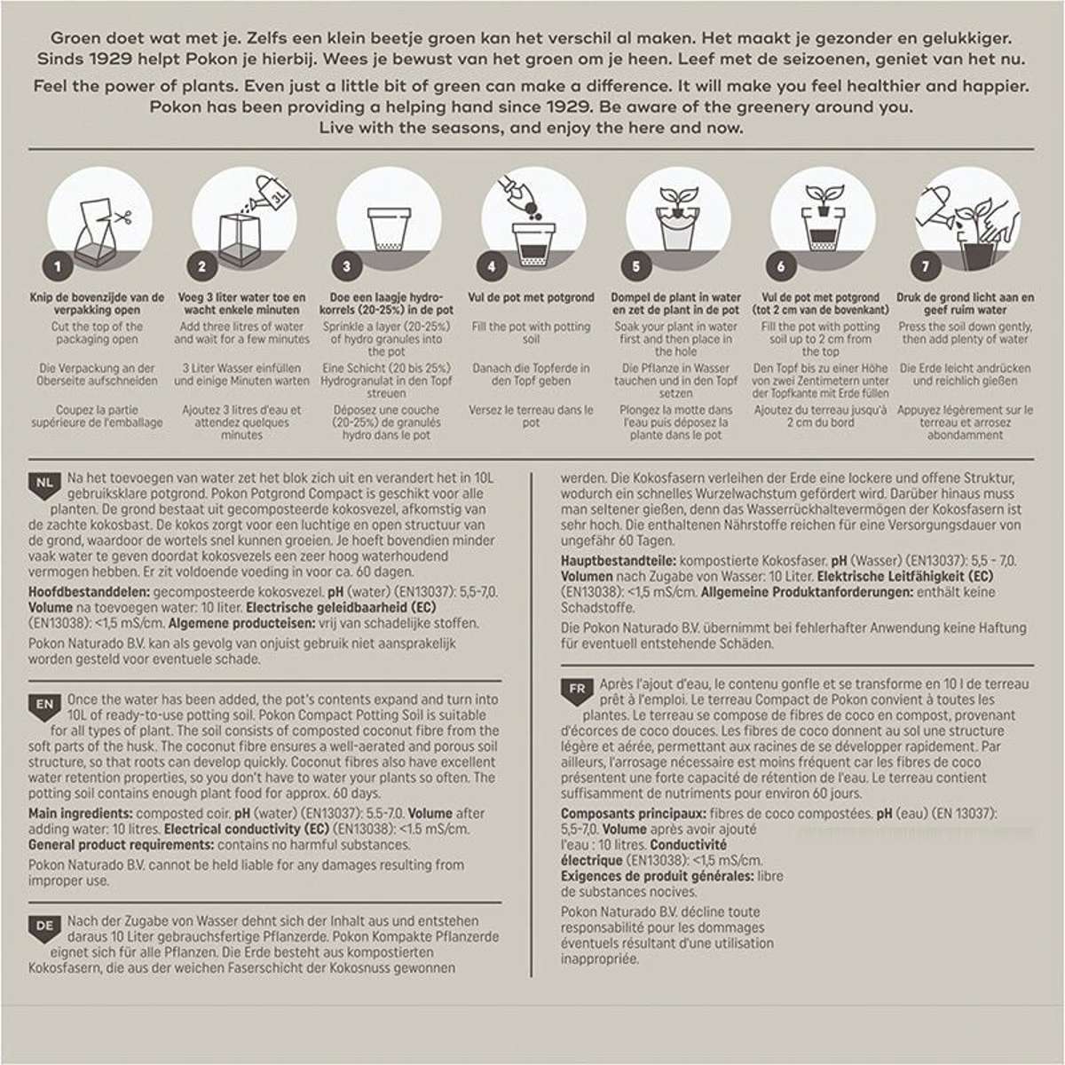 Convient à toutes les plantes : pour les plantes en bordure et pour le rempotage à l’intérieur et à l’extérieur. SoinsLa terre est emballée dans un sac en plastique. Pour utiliser ce sol, ouvrez ce sac et ajoutez 3 litres d’eau dans l’emballage et en quelques minutes, le sol est prêt à l’emploi. Convient à toutes les plantes : pour les plantes en bordure et pour le rempotage à l’intérieur et à l’extérieur. Grâce à la base en fibre de coco, l’eau est moins souvent nécessaire qu’avec un terreau « normal ». Par conséquent, n’arrosez que lorsque le sol est sec. Après environ 2 mois, la nutrition s’estompe.